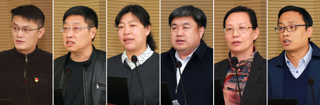 从左至右:文科处、国有资产与实验室管理处、教务处、出版社期刊社、国际合作与交流处和研究生院主要负责人