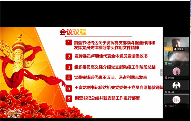 为鼓舞党员战“疫”士气,党支部宣传委员卢羽佳代表全体党员宣读《众志成城 战胜疫情——国资处党支部倡议书》,号召党支部和党员干部充分发挥战斗堡垒和先锋模范作用,群防群控,共克时艰。组织委员高义强从加强组织领导、落实疫情防控举措、协同推进事业发展和加强正面宣传引导、发挥党员先锋模范作用等四个方面总结汇报国资处党支部防疫工作开展情况及取得的阶段性成效。