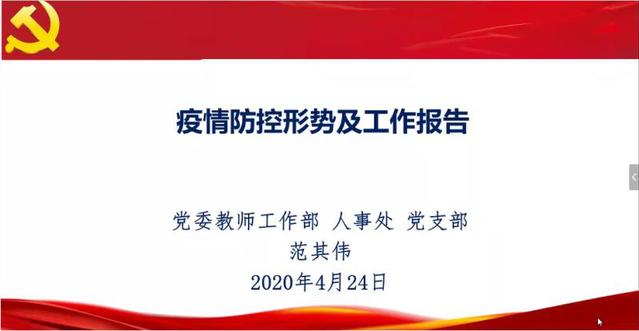 为做好疫情防控常态化背景下党支部和处内各项工作,进一步深化“人事处小讲堂”党建活动品牌建设,促进党建和业务深度融合,4月24日下午,机关党委教师工作部、人事处党支部通过视频形式召开全体党员会议(“人事处小讲堂”第5讲),党支部书记范其伟以“疫情防控形势及工作报告”为题,传达学习了中央和上级部门关于疫情防控、复工复学的最新指示精神以及学校的相关规定和要求,总结了近期党支部和处内开展的相关工作,并对党支部和处内下一步工作进行部署。党支部副书记李召斌主持会议。