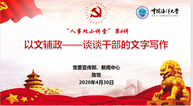 在常态化疫情防控背景下,为进一步加强支部学习,深化支部“人事处小讲堂”党建活动品牌建设,4月30日下午,机关党委教师工作部、人事处党支部通过视频形式组织“人事处小讲堂”系列活动第6讲,邀请学校党委宣传部部长陈鷟教授以“以文辅政——谈谈干部的文字写作”为题作专题讲座。党支部书记范其伟主持会议。