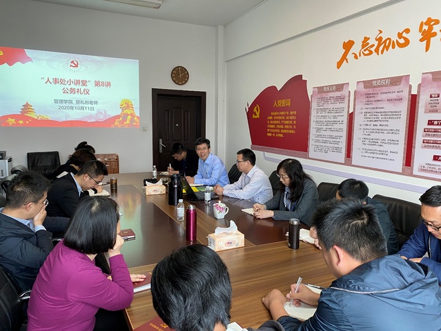 为进一步加强“人事处小讲堂”党建活动品牌和“样板党支部”建设,推进党支部学习理论学习与实际工作相结合,10月11日下午,机关党委教师工作部、人事处党支部组织“人事处小讲堂”系列活动第8讲,邀请管理学院蔡礼彬老师以“公务礼仪规范”为题作专题报告。党支部书记范其伟主持报告会。