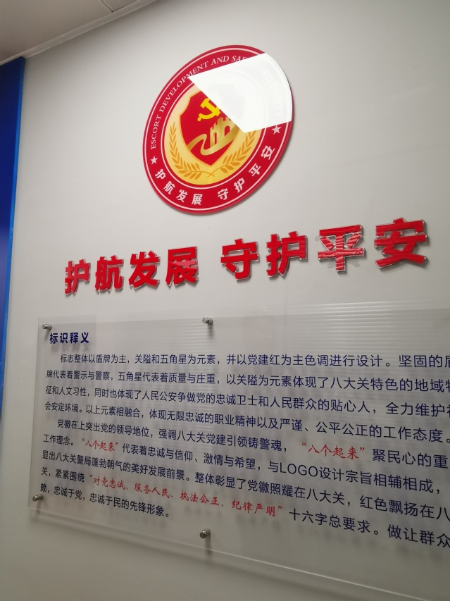 八大关派出所标识主题为“护航发展,守护平安”。标志整体以盾牌为主,以关隘和五角星为元素,并以党建红为主色调进行设计。党徽在上突出党的领导地位,强调八大关党建引领铸警魂。“八个起来”聚民心的重要工作理念,“八个起来”代表着忠诚与信仰、激情与希望。标识整体紧紧围绕“对党忠诚、服务人民、执法公正、纪律严明”十六字总要求,做让群众信赖、忠诚于党、忠诚于民的先锋形象。