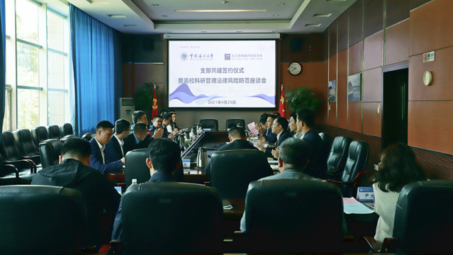 为了迎接中国共产党建党100周年,深入贯彻落实党的十九届五中全会和中共中央全面依法治国工作会议精神,搭建基层党组织交流平台,探索“科技+法律”、“高校+律所”的支部共建模式,机关科学技术处党支部与北京德和衡(青岛)律师事务所党支部于4月25日上午,在行远楼第五会议室举办了支部共建签约仪式暨高校科研管理法律风险防范座谈会。集团副总裁、高级合伙人,北京德和衡(青岛)律师事务所主任、党支部书记张美萍等10位律师党员代表以及科学技术处党支部全体党员参加本次活动。