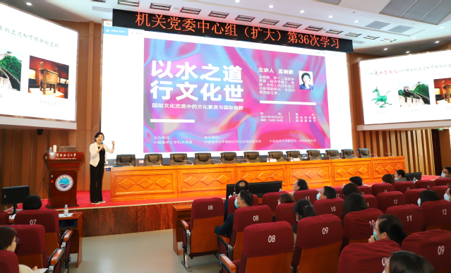 5月20日下午,机关党委举办了第36次中心组(扩大)学习。本次学习活动继续采取“1+1”学习模式,由机关党委主办、国际合作与交流处党支部和教务处评估办党支部承办,邀请了第十二届政协常委,文化部原副部长,全国妇联原副主席,经济学博士孟晓驷教授作了题为《以水之道,行文化世——国际文化交流中的文化素质与国际视野》的报告。机关党委委员、机关各党支部书记、机关党员干部和学生代表近六百人共同参加了学习。中国工程院院士、副校长李华军主持了本次报告会。