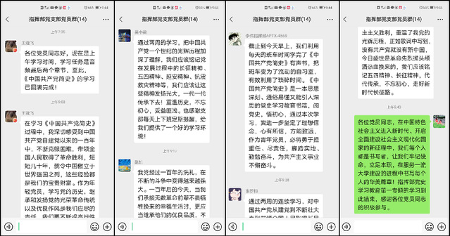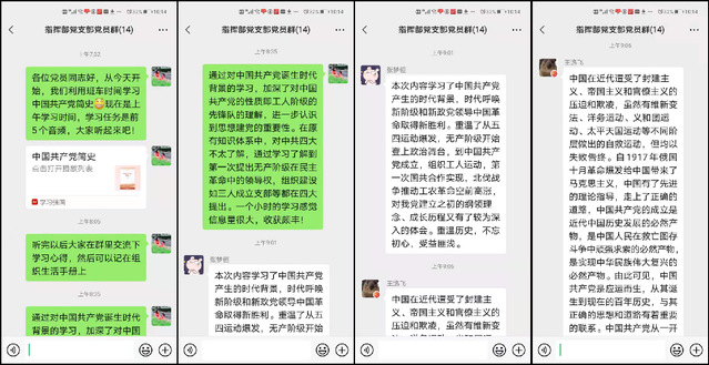 在本次学习过程中,支部党员积极参与,及时分享学习心得体会。通过对建党百年历史的重温,党员们对中国共产党不断克服困难、勇于迎接挑战、始终保持自身先进性、带领全国人民取得革命胜利,在中国特色社会主义道路上稳步前进有了更深切的体会。党员纷纷表示,学习党的历史,继承和发扬党的光荣革命传统及优良作风是每位党员应尽的义务,要通过学习不断提高党性修养,坚定理想信念,增强政治鉴别力和政治敏锐性,从党的历史中汲取开拓前进的智慧和力量。在全面建设社会主义现代化国家的新征程中,我们每个人都是参与者,要立足本职、扎实工作,为西海岸校区建设和学校一流大学建设贡献力量。