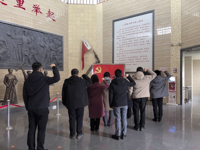 在纪念馆的红色教育阵地前,全体党员整齐列队,面向鲜红的中国共产党党旗,举起右拳,庄严重温入党誓词。“我志愿加入中国共产党,拥护党的纲领,遵守党的章程……”铿锵有力的誓言回荡在纪念馆内,更镌刻在每一位党员的心中。这不仅是对革命先烈的深切缅怀与致敬,更是对初心使命的再次叩问与坚守,进一步坚定了党员们为党和人民事业不懈奋斗的信念与决心。